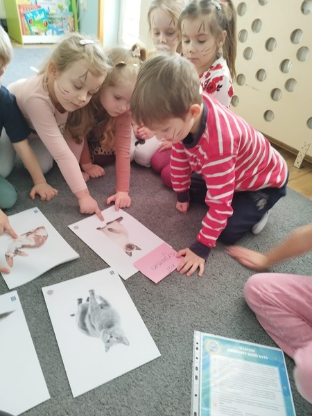 Dnia 16 lutego świętowaliśmy Dzień Kota. Poznaliśmy rasy kotów, omówiliśmy to, jak należy się nimi opiekować. Poznaliśmy nowe pojęcia tj. weterynarz, schronisko. Na zakończenie zajęć było malowanie buziek oraz praca plastyczna "Garfield".