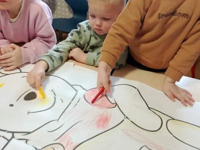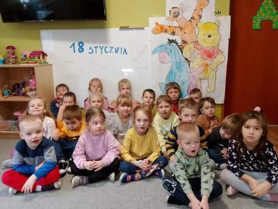 W dniu 18 stycznia w naszym przedszkolu był obchodzony Dzień Kubusia Puchatka. Tego dnia dzieci zapoznały się z książką A.A.Milne. Wysłuchały fragmentu opowiadania o urodzinach Kłapouchego. „Upiekły” ciasto urodzinowe z piosenką „Najłatwiejsze ciasto w świecie”. Określały położenie plastra miodu względem osoby– ulubionego przysmaku misia. Pokolorowały mega kolorowankę przyjaciół Kubusia Puchatka. Wzięły udział w misiowej gimnastyce przy muzyce.